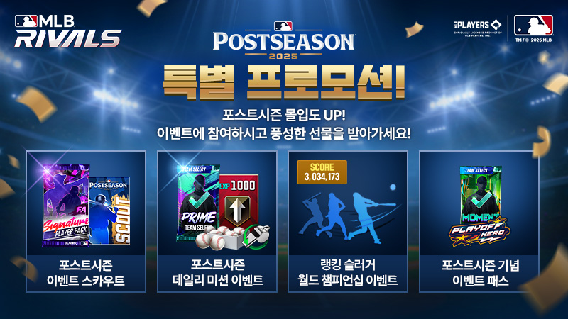 ■ 이벤트 기간 동안 2025 MLB 포스트시즌 관련 이벤트를 통해 최대 200장의 [2025 포스트시즌 스카우트 티켓]을 획득하여, 스카우트 진행 횟수에 따라 [FA 시그니처팩]을 포함한 다양한 보상을 획득할 수 있는 이벤트입니다.