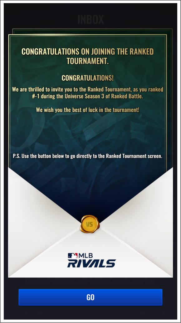 - 랭킹 토너먼트에 진출하신 구단주님께는 우편함으로 랭킹 토너먼트 초대장이 발송됩니다.