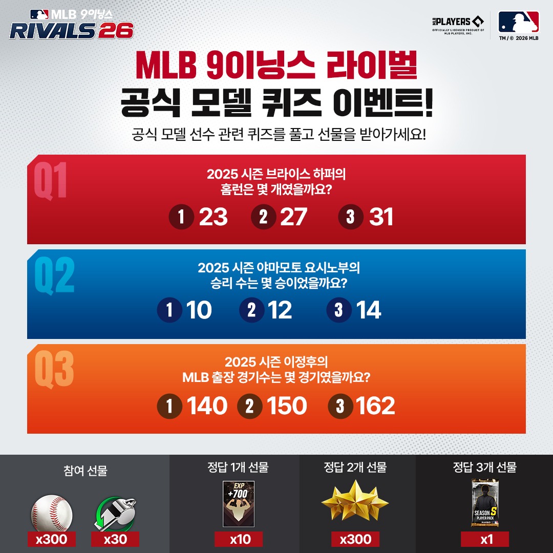 - MLB 9이닝스 라이벌 공식 모델 선수 관련 퀴즈에 응모하시면 참여 완료!