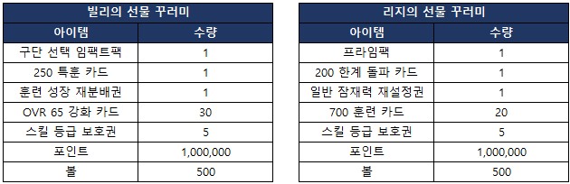 - 빌리와 리지의 선물 꾸러미 중 1종만 선택하여 획득할 수 있습니다.