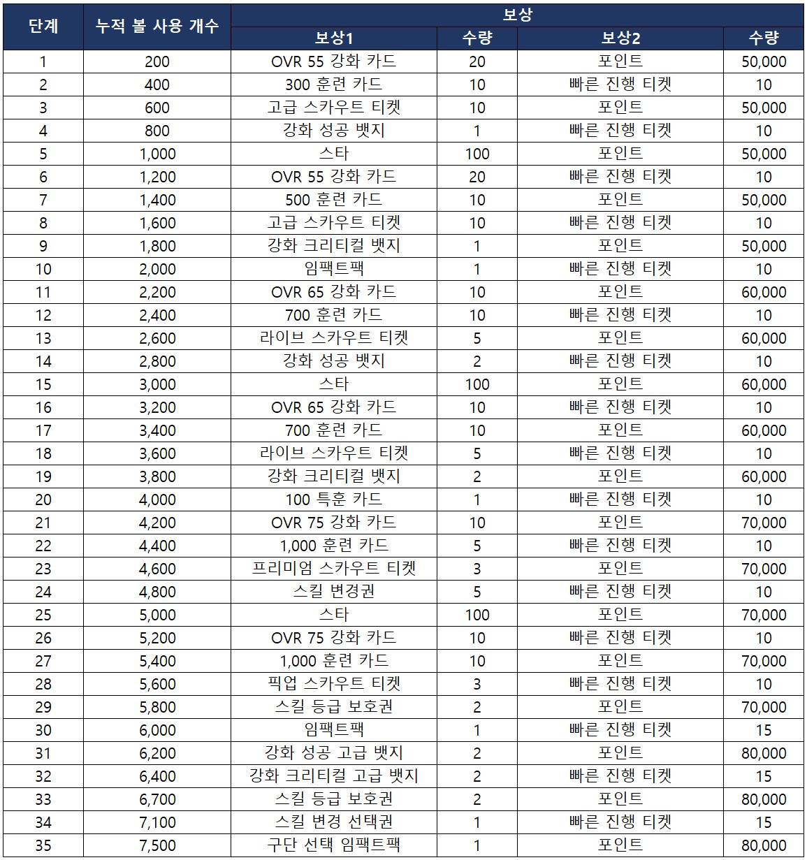 - 이벤트 기간 중 볼 사용량에 따라 단계별로 정해진 보상 획득