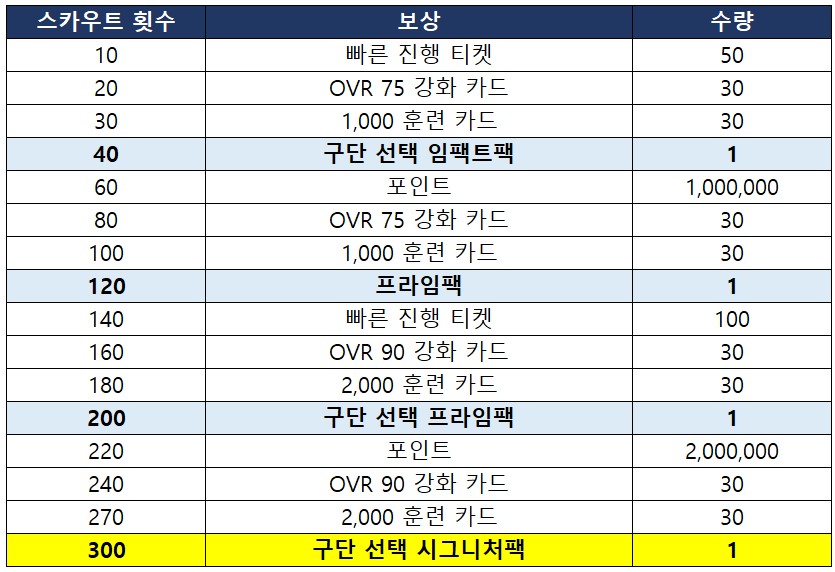 > 매일 2회씩 150일간 진행하면 300회 누적 구매 보상인 구단 선택 시그니처팩을 획득할 수 있습니다.