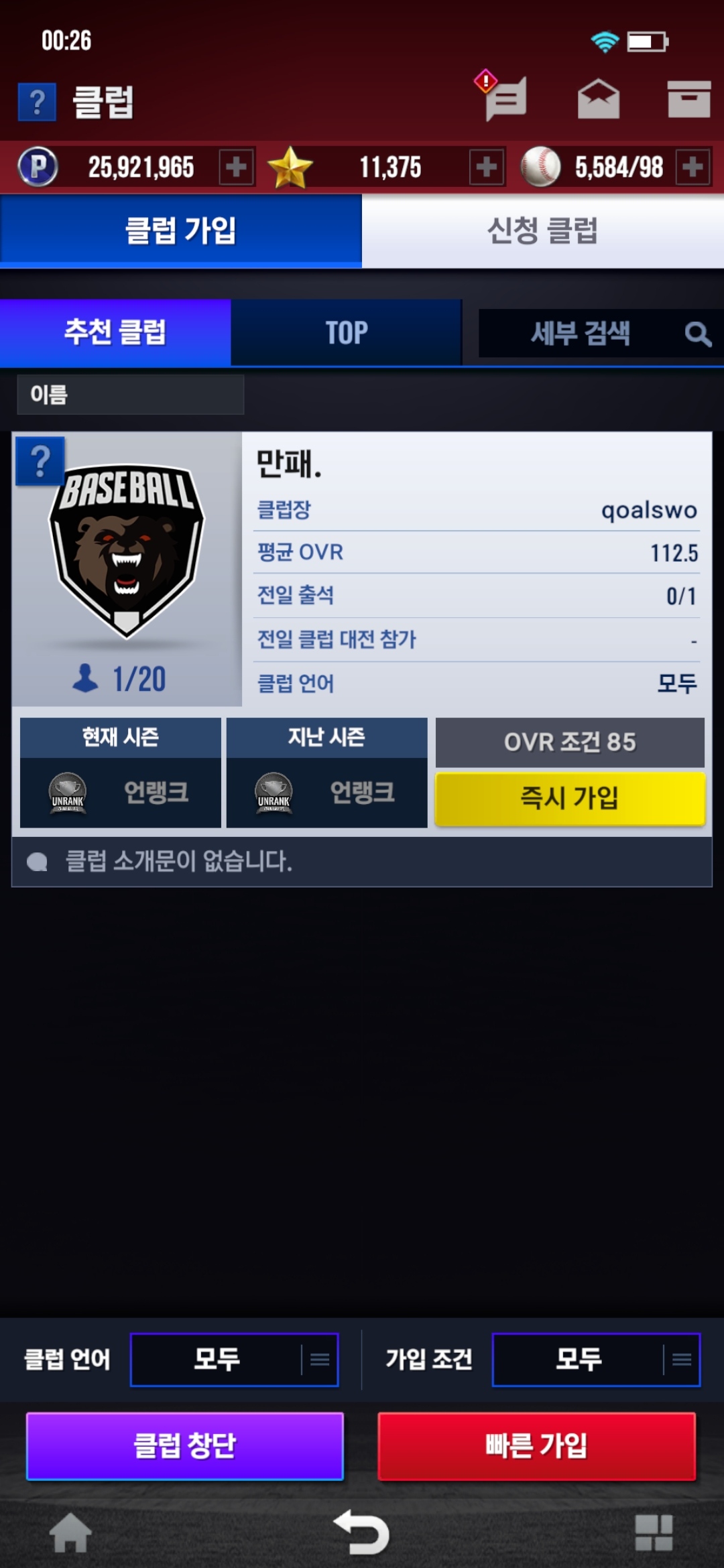조건은 OVR 85이상입니다