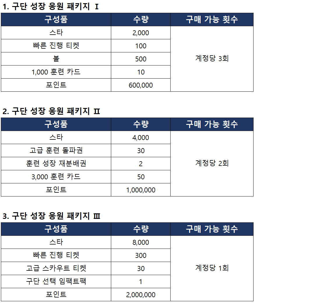 구단 성장을 위한 다양한 아이템을 획득할 수 있는 구단 성장 응원 패키지가 신규 판매 되어 안내드립니다.