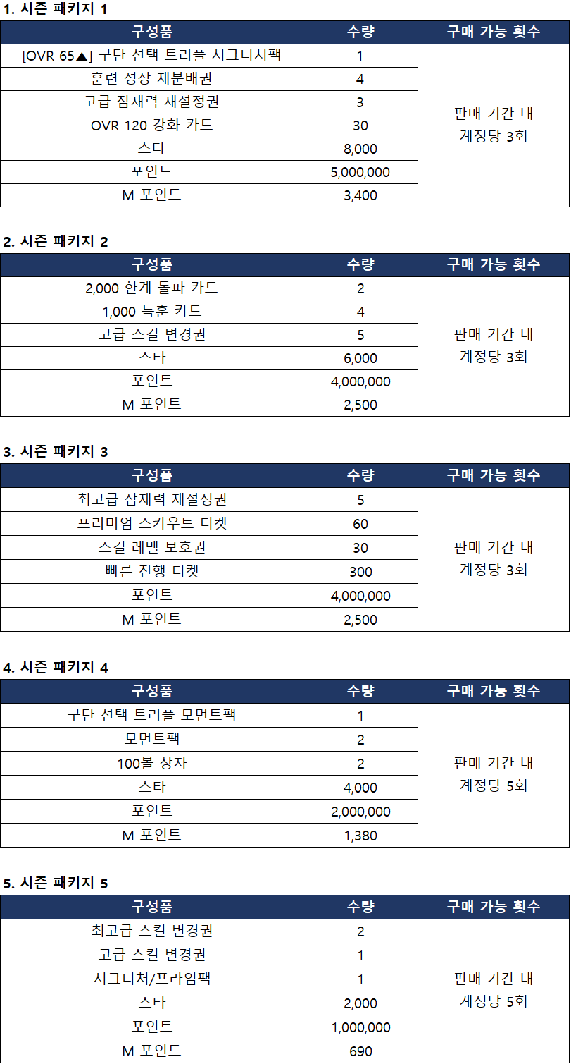 ※ 시즌 패키지 4번에서 획득 가능한 ‘구단 선택 트리플 모먼트팩’ 및 ‘모먼트팩’에서는 콘텐츠 상점 혹은 이벤트로 획득 가능한 엠블럼의 선수는 포함되어 있지 않습니다.