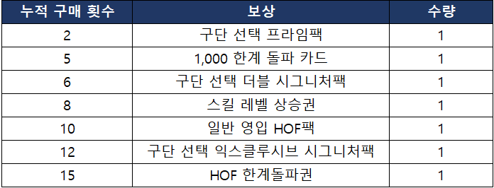 - 시즌 패키지 누적 구매 횟수에 따라 아래의 보상을 획득할 수 있습니다.