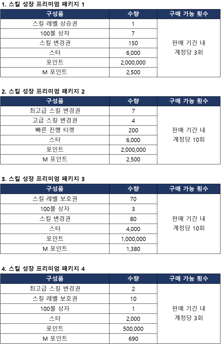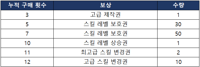 - 스킬 성장 프리미엄 패키지 누적 구매 횟수에 따라 아래의 보상을 획득할 수 있습니다.