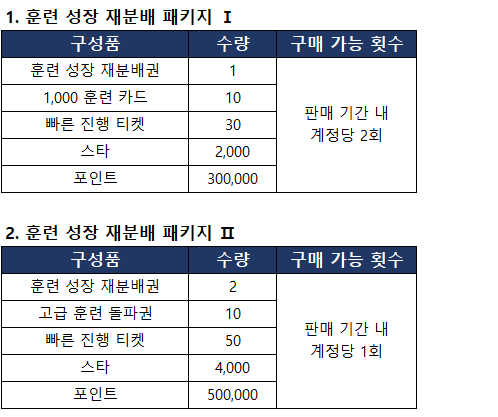 훈련 성장 재분배권 및 다양한 아이템으로 구성된 [훈련 성장 재분배 패키지]가 신규 판매될 예정으로 안내드립니다.