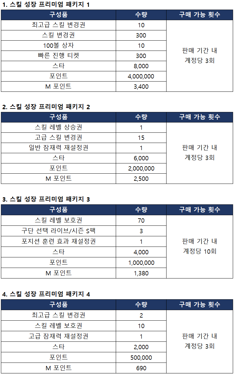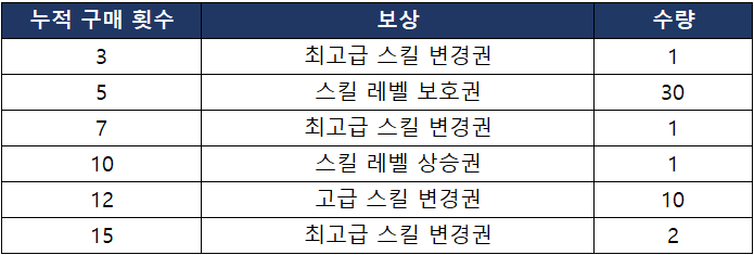 - 스킬 성장 프리미엄 패키지 누적 구매 횟수에 따라 아래의 보상을 획득할 수 있습니다.