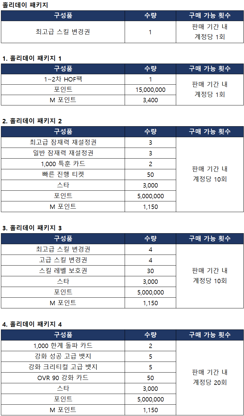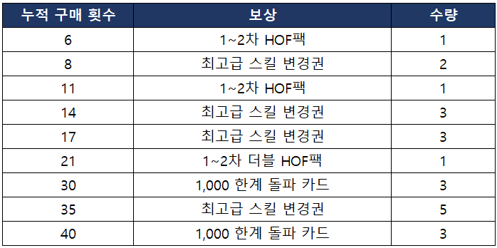 - 1~2차 HOF팩 및 1~2차 더블 HOF팩에서는 1~2차 HOF 스페셜 패키지에서 획득 가능한 선수 및 패키지 판매 시점 일반 영입으로 획득 가능한 선수들만 획득할 수 있습니다.