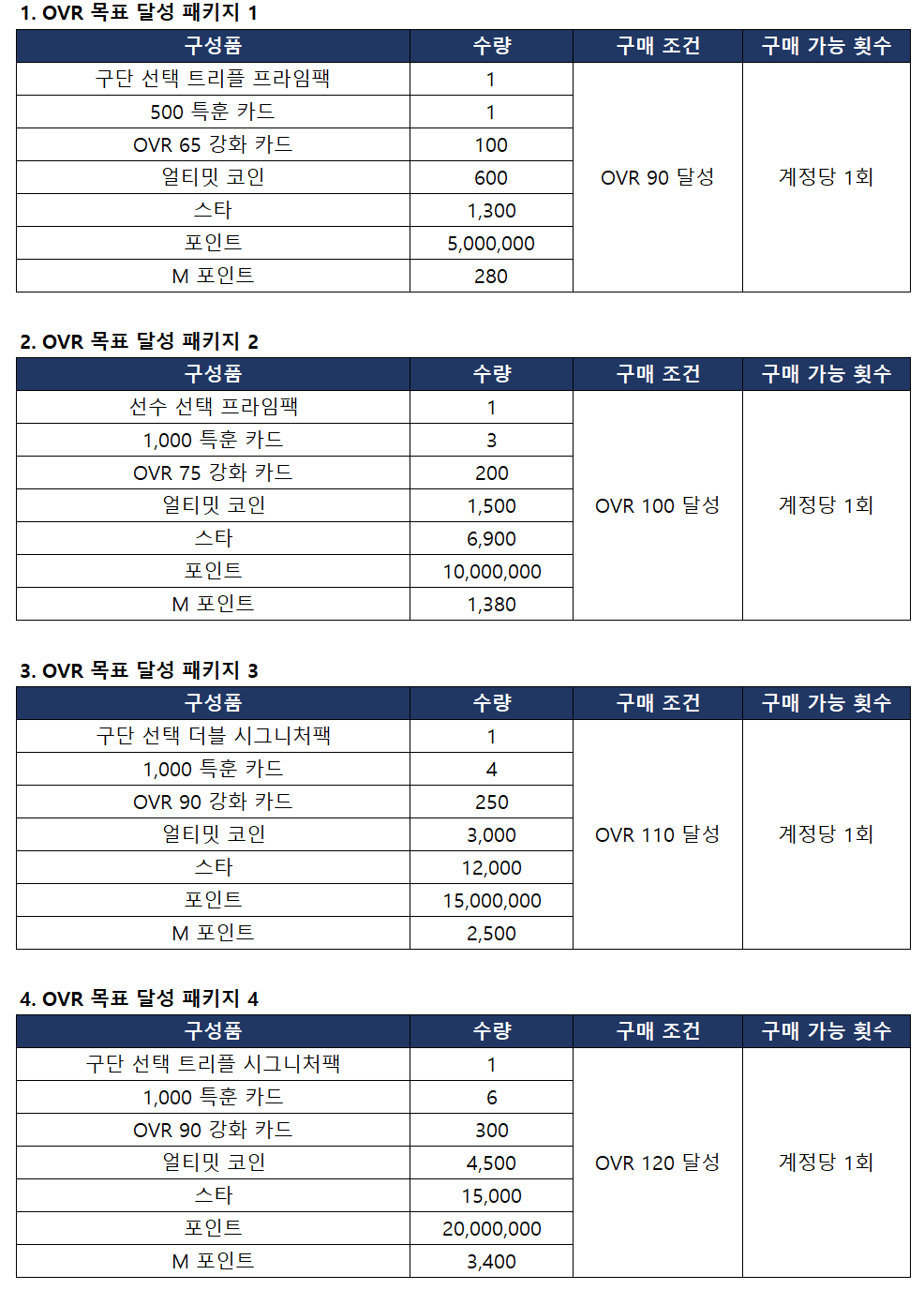 - 메인 화면 우측 하단 > 스타디움 샵 > 추천 > 목표 달성 패키지 탭에서 구매 가능
