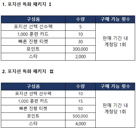 원하는 포지션을 빠르게 보강할 수 있도록 구성된 [포지션 특화 패키지]가 신규 판매될 예정으로 안내드립니다.