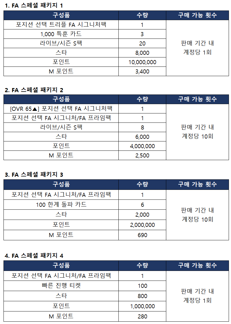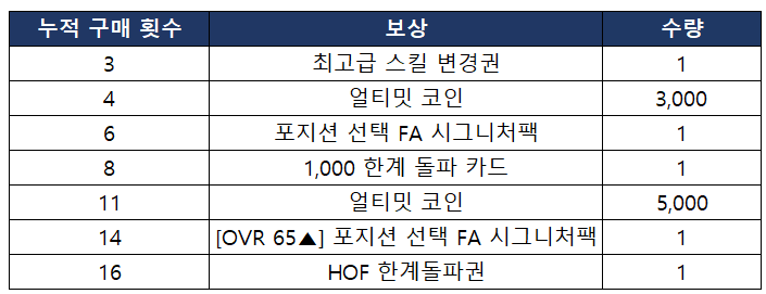 - FA 스페셜 패키지 누적 구매 횟수에 따라 아래의 보상을 획득할 수 있습니다.