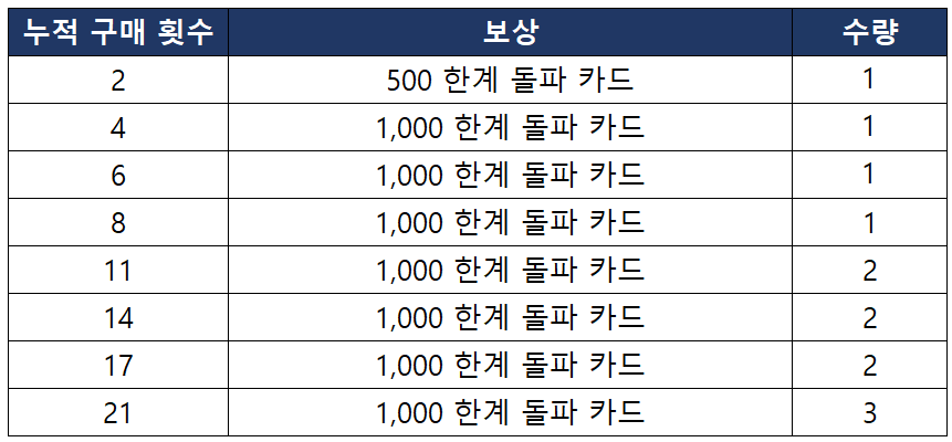- 한계 돌파 지원 패키지 누적 구매 횟수에 따라 아래의 보상을 획득할 수 있습니다.