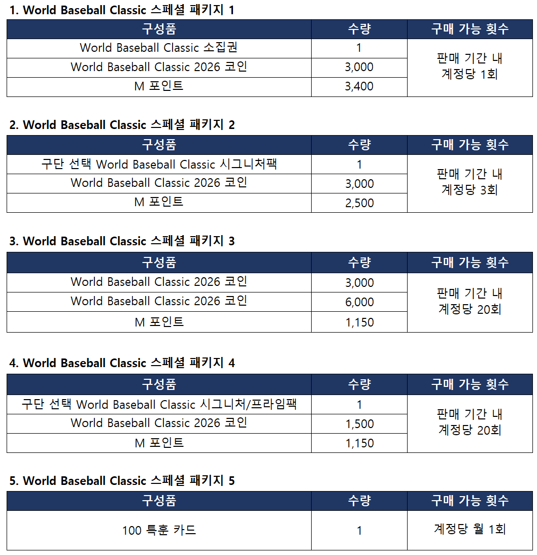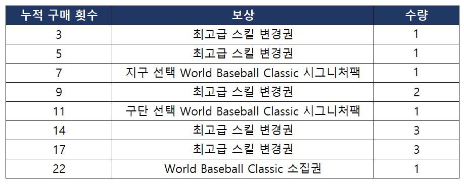 - World Baseball Classic 스페셜 패키지 누적 구매 횟수에 따라 아래의 보상을 획득할 수 있습니다.