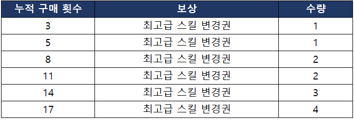 - 스킬 변경 슈퍼 패키지 누적 구매 횟수에 따라 아래의 보상을 획득할 수 있습니다.
