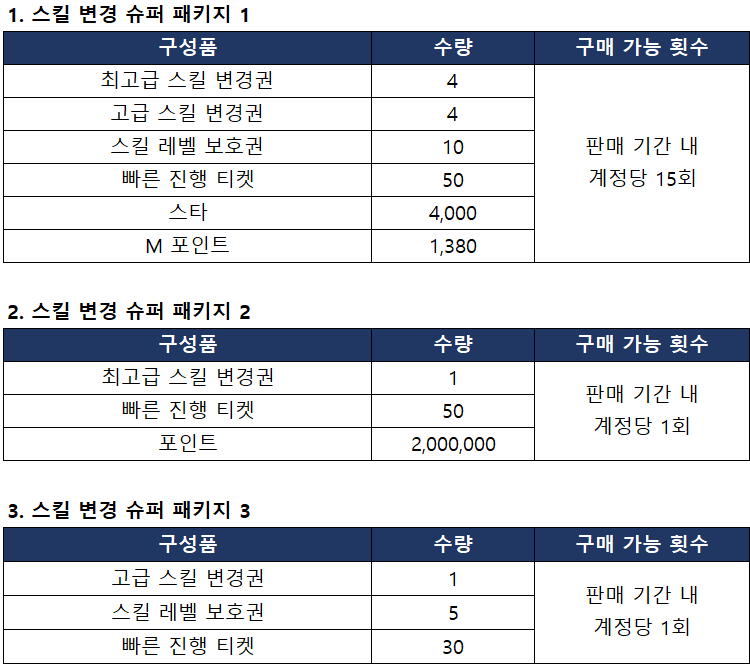 - 스킬 변경 슈퍼 패키지 2, 3은 스타 및 포인트로 구매 가능한 상품입니다.
