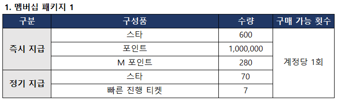 - [멤버십 패키지]는 구매 이후 매일 아이템을 수령할 수 있는 패키지입니다.