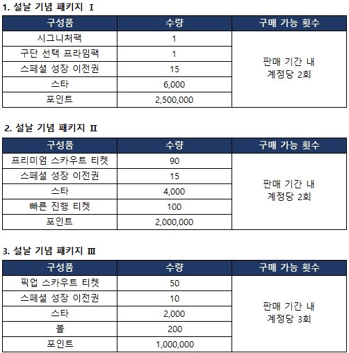 2024년 설날을 맞이하여 시그니처팩, 구단 선택 프라임팩 및 대량의 스카우트 티켓들로 특별하게 구성된 [설날 기념 패키지]가 판매될 예정입니다.