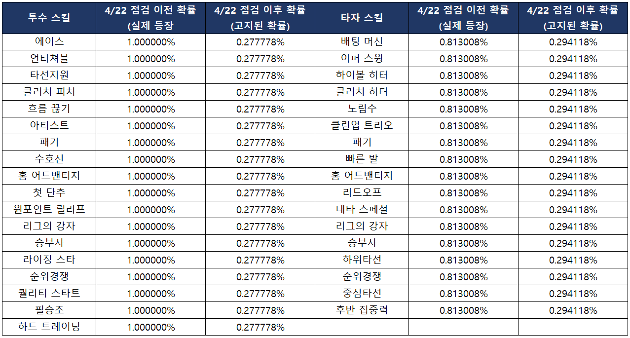 예2) 투수의 ‘S등급 에이스’ 스킬이 나올 확률은 확률표에 게시된 0.008333%이 기획한 확률이 맞으나, 4/22(월) 11:00 이전까지 0.030000%로 약 3.60배 높게 등장하고 있었습니다.