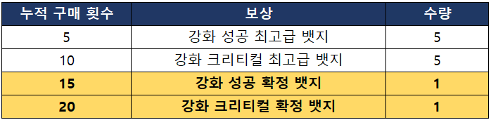 - 강화 뱃지 스페셜 패키지 누적 구매 횟수에 따라 아래의 보상을 획득할 수 있습니다.