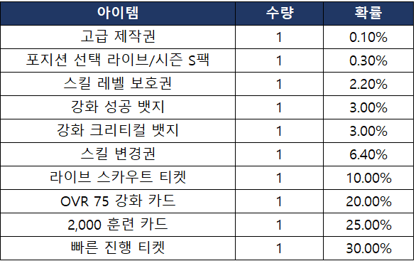 - 아래의 구성품 중 1종을 확률에 따라 획득할 수 있습니다.