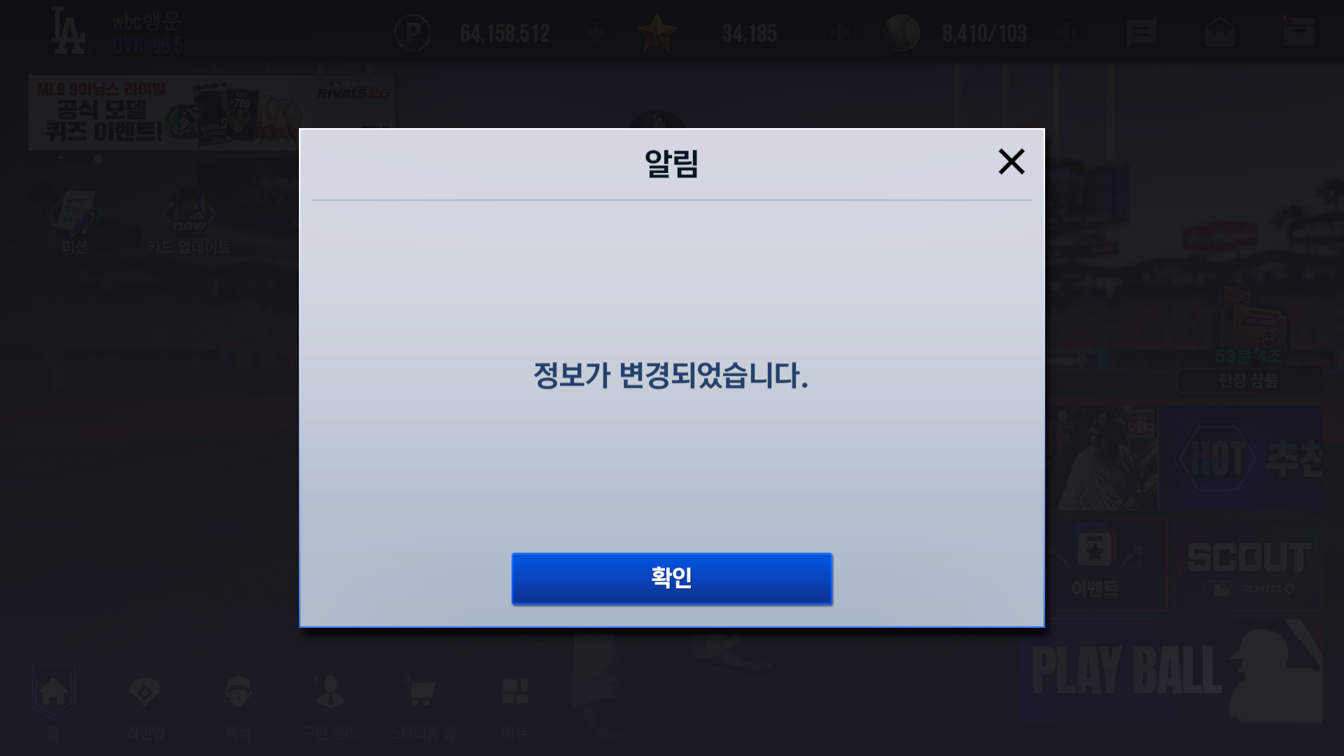 주력선수 오타니 6→9로 초월할려고 하는데 이런메시지 뜨면서 팅깁니다 버그같아요 고쳐주세요