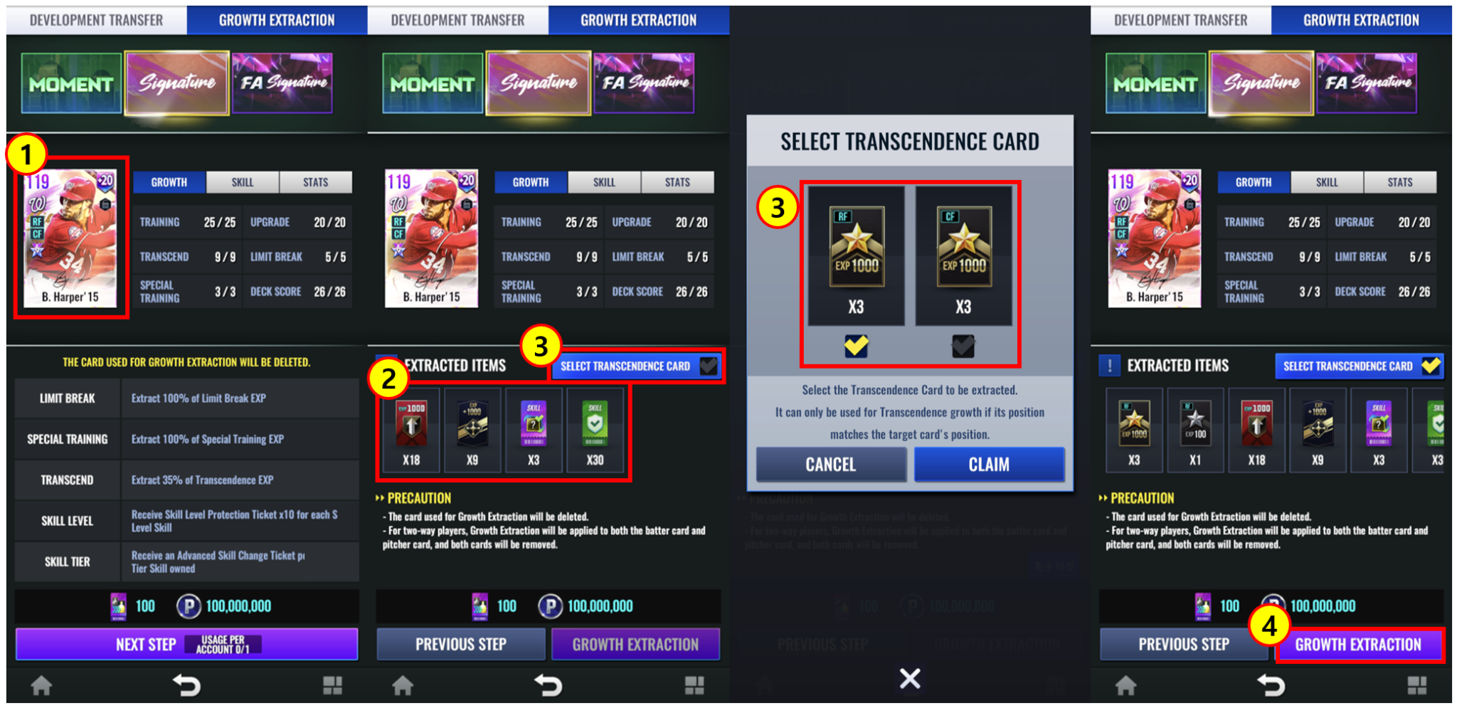 - 성장 추출을 진행할 카드는 모든 라인업 및 이벤트에서 장착 해제된 상태여야 합니다.