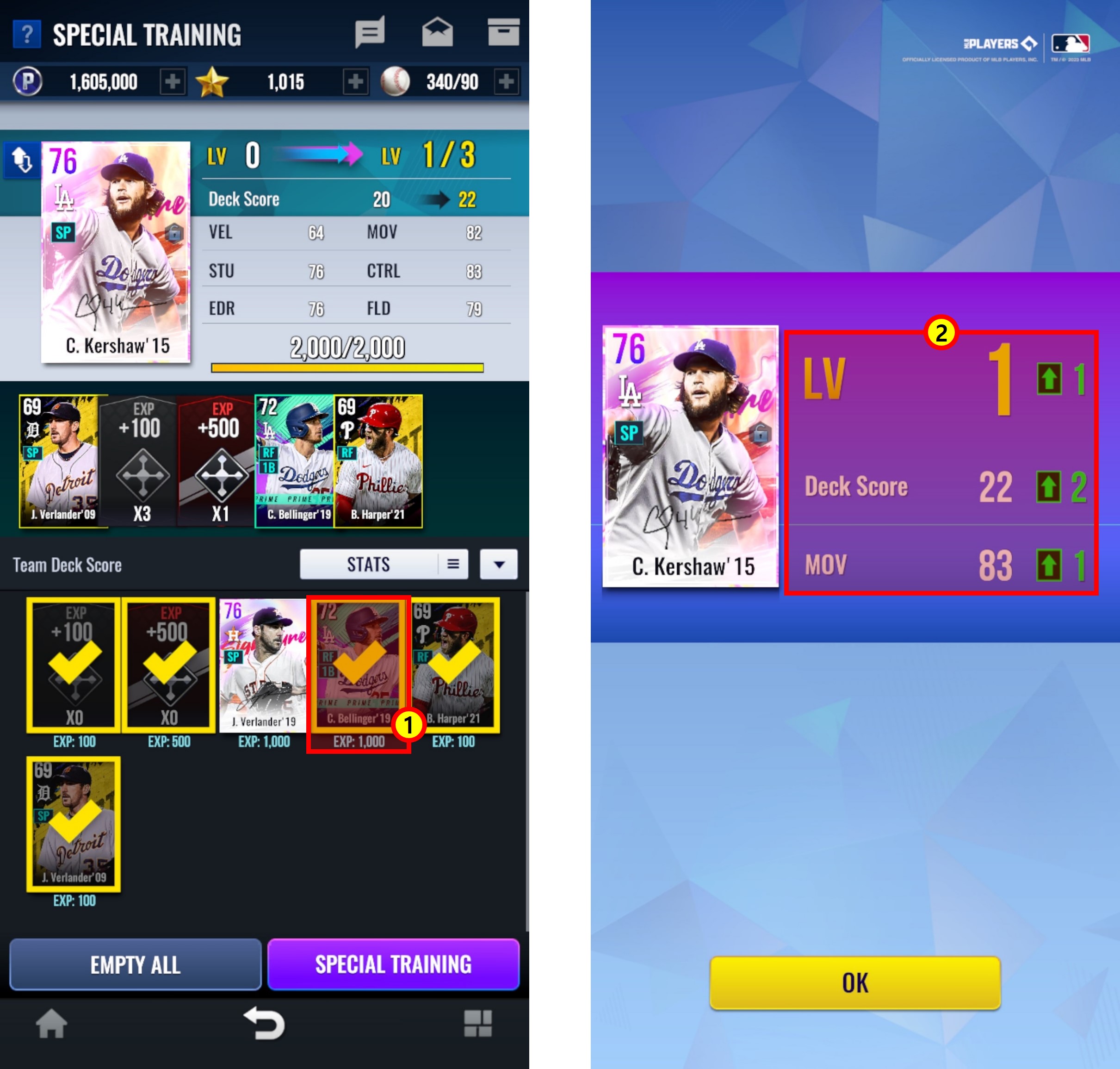 ① 등급별 특훈권, 특훈 경험치 카드, 스페셜 카드를 통해 특훈을 진행할 수 있습니다. 동일한 팀의 스페셜 카드는 2배의 경험치를 제공합니다.