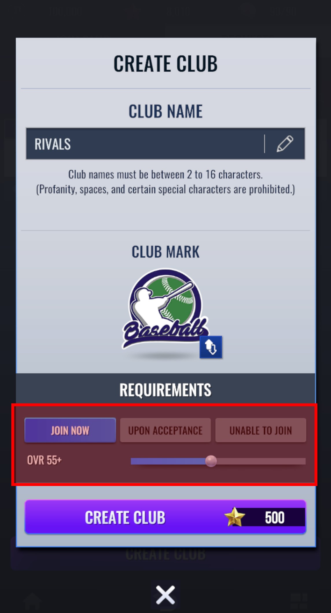 - 클럽 미가입 상태일 경우 클럽 창설이 가능하며, 창설 비용으로 500 스타가 필요합니다.
