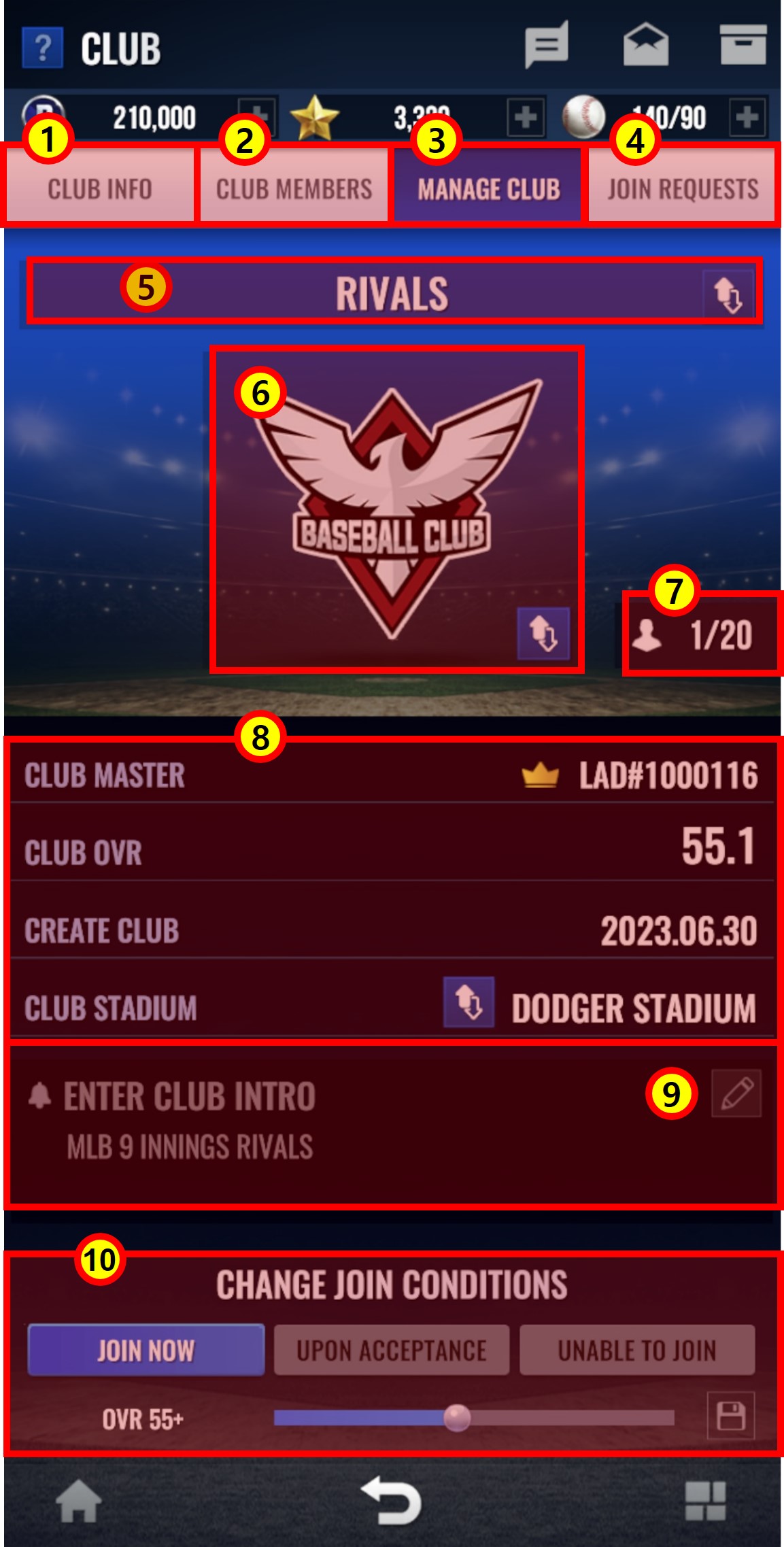 ⑩ 클럽 가입 형태와 OVR 조건을 설정할 수 있습니다.