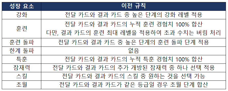 - 성장 요소에 따라 전달 카드와 결과 카드의 성장치가 합산 되거나 비교를 통해 높은 성장치가 적용됩니다. 자세한 내용은 아래 성장치 이전 규칙에서 확인할 수 있습니다.