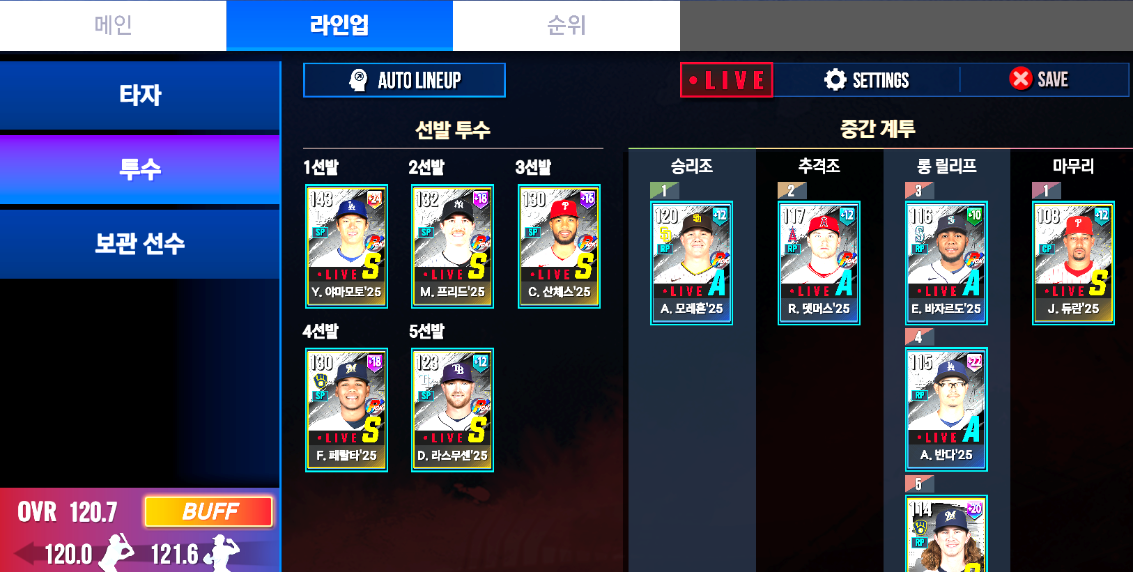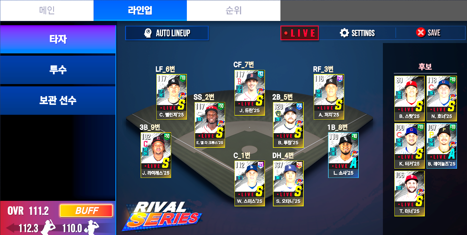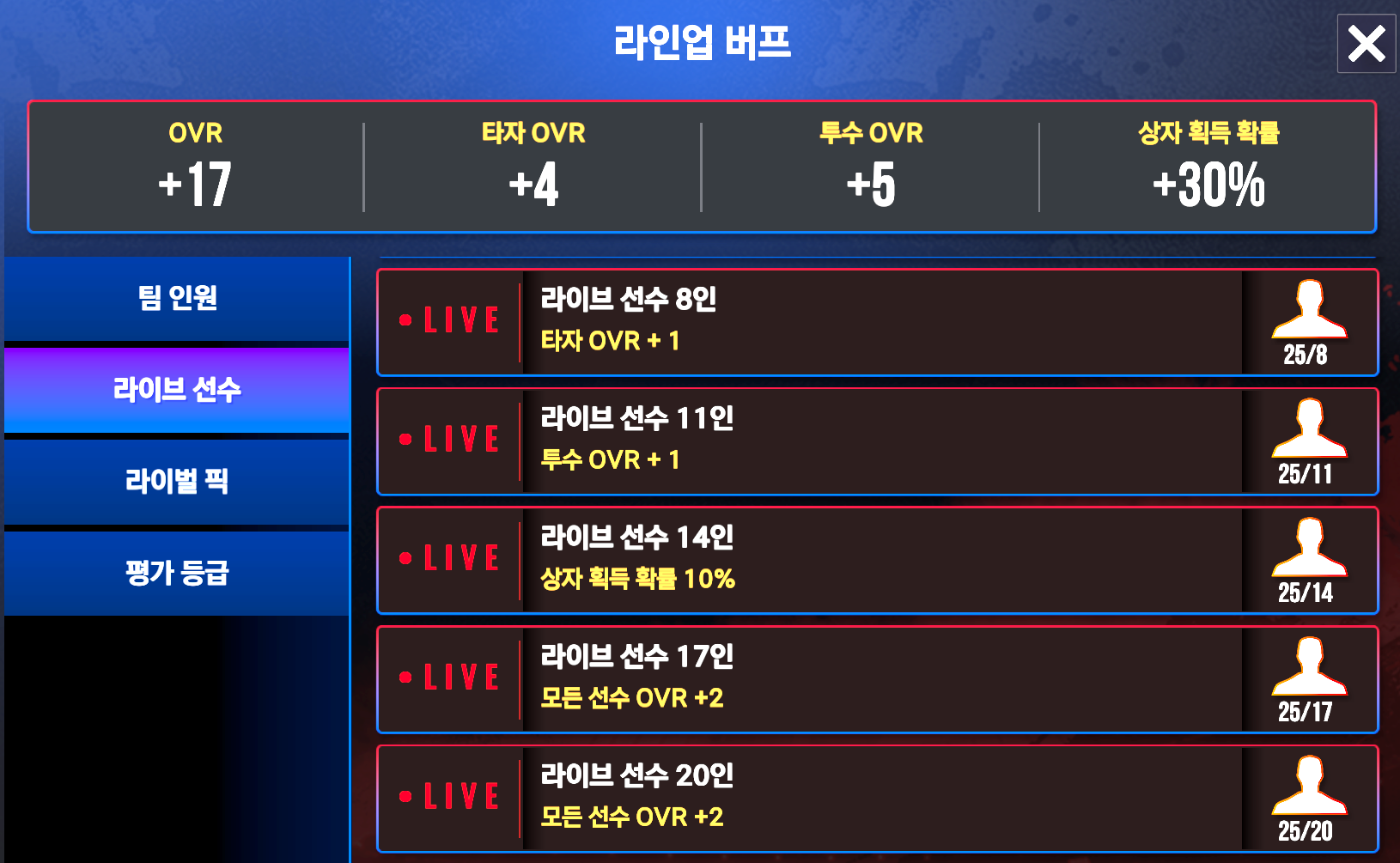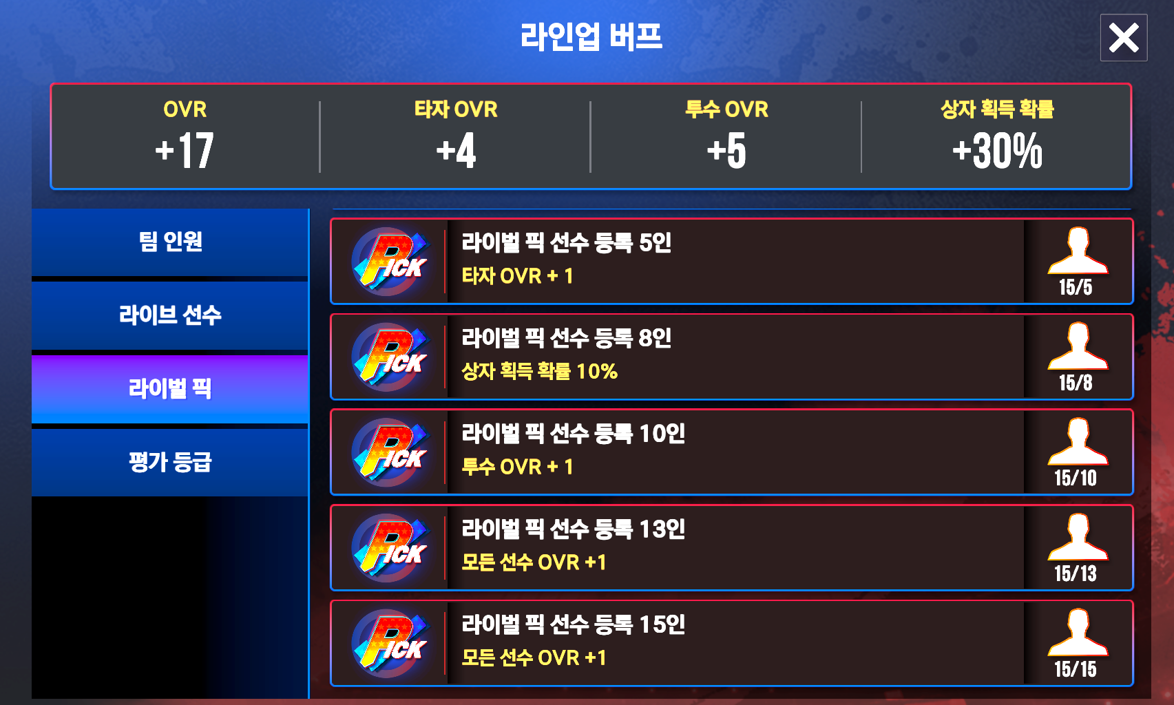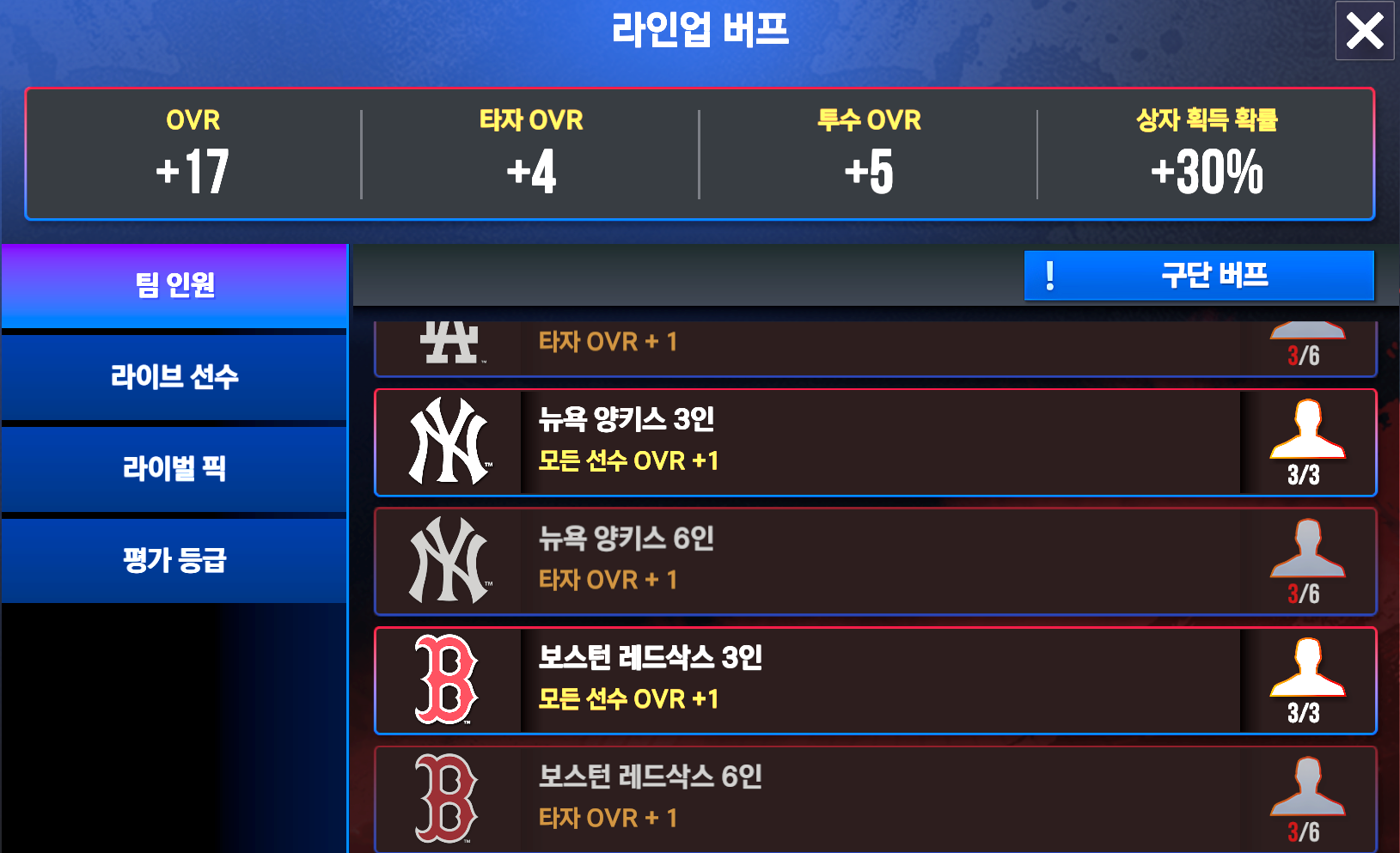 자 이제 팀별 보너스 및 라이브 보너스, 등급별 보너스를 챙겨서 OVR 을 올려 봅니다.
