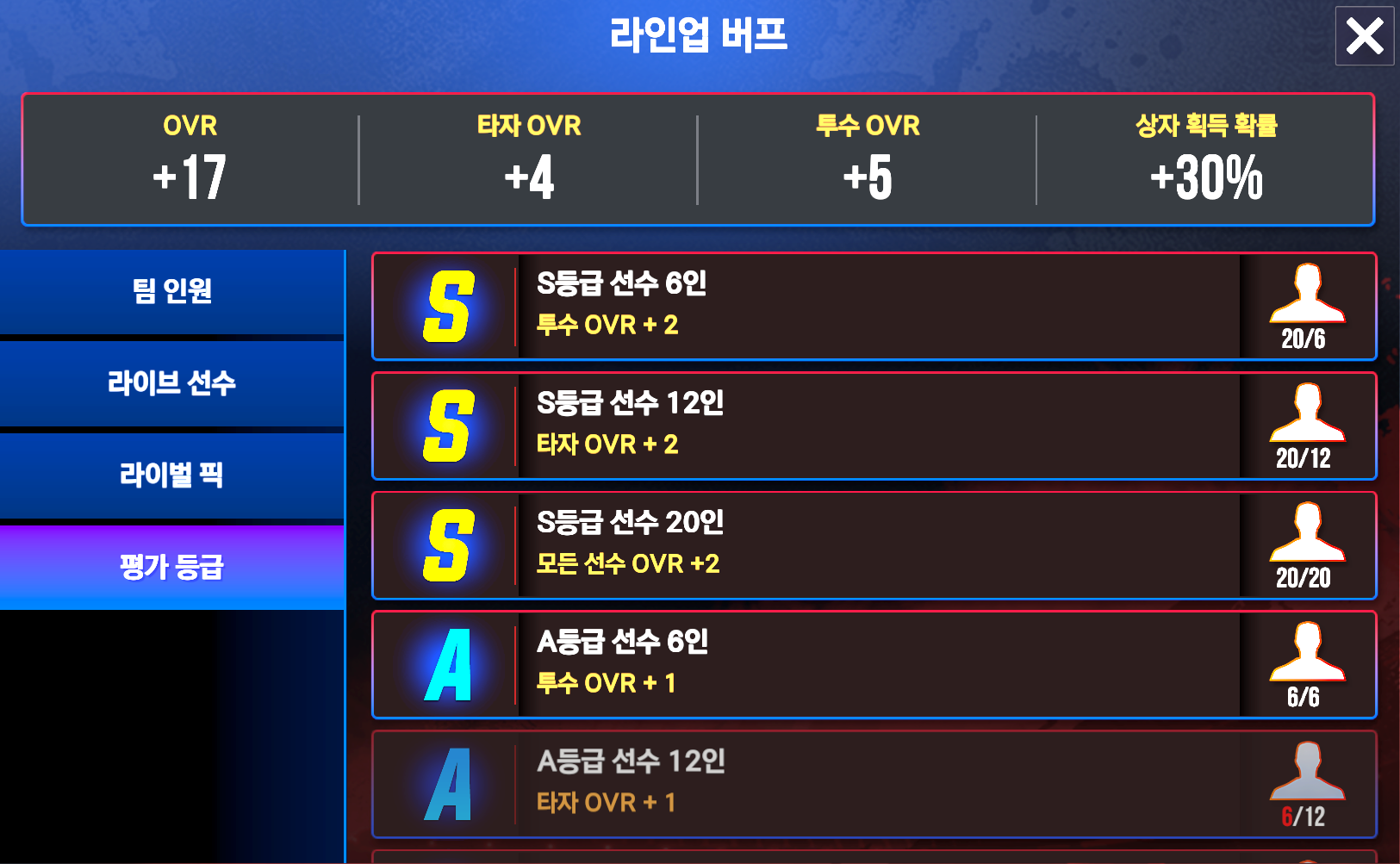 그리구 S등급 20인 A등급 6인을 맞춰서 역시 OVR 보너스를 챙겨줍시다.