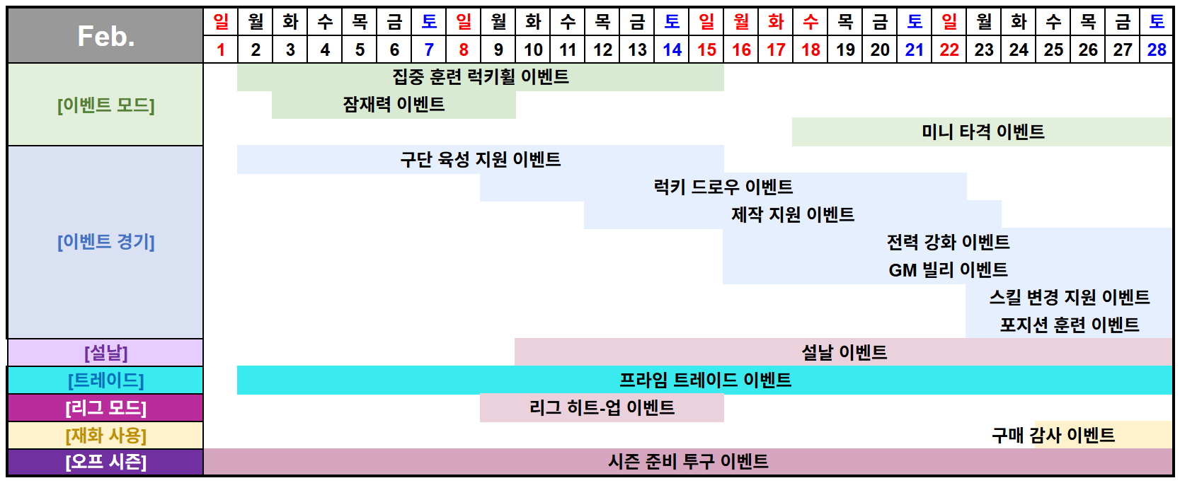 [이벤트 경기] | 구단 육성 지원 이벤트 | 2/2(월) 00:00 | 2/15(일) 23:59 | 14일 |