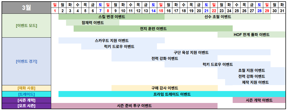 [이벤트 경기] | 구단 육성 지원 이벤트 | 3/9(월) 00:00 | 3/29(일) 23:59 | 21일 |