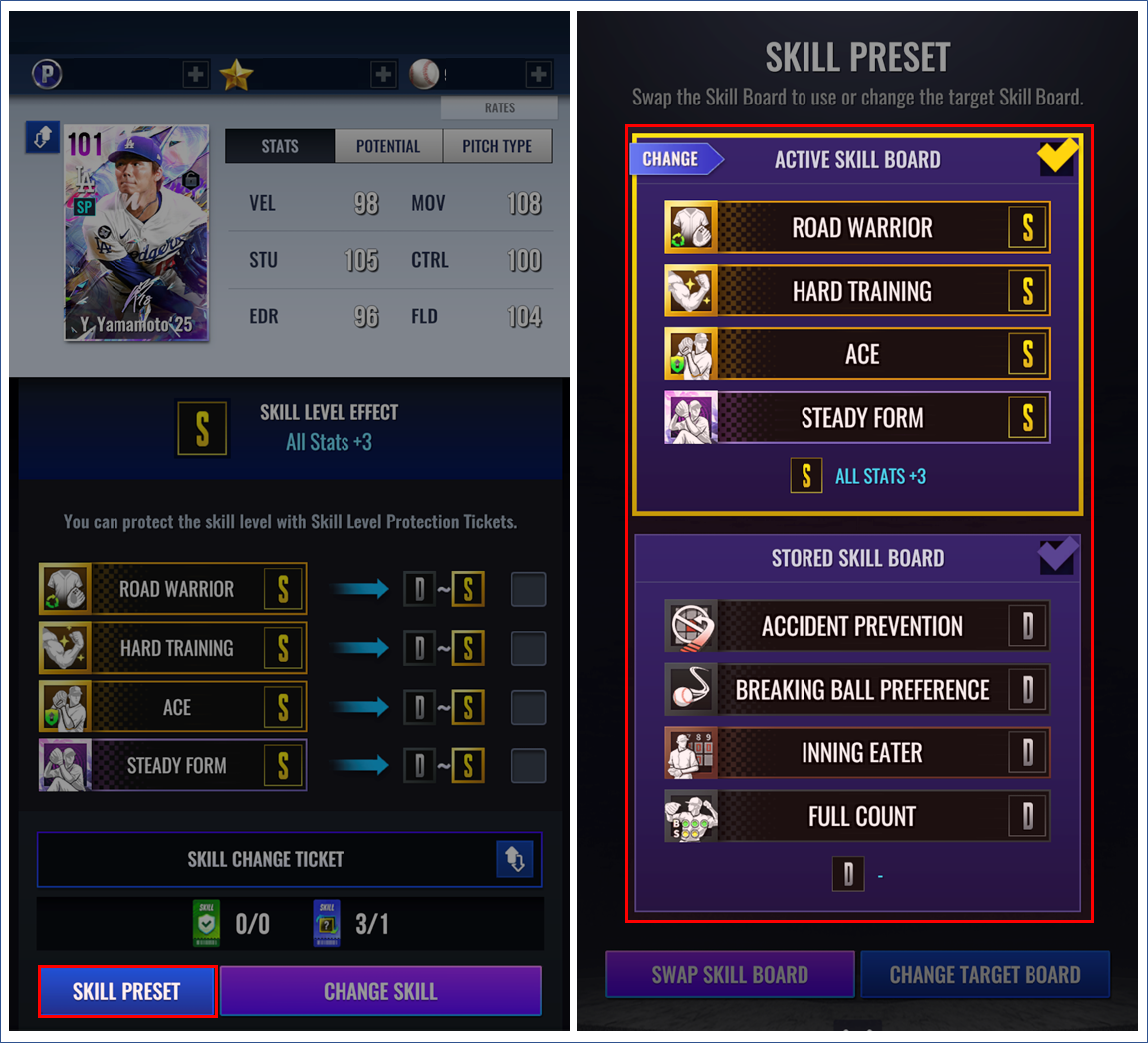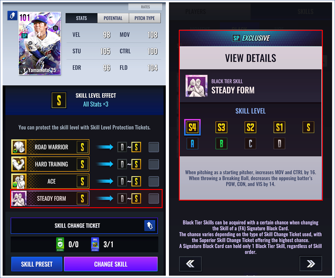 - v3.08.00 업데이트에서는 선발 투수(SP)와 지명 타자(DH) 포지션의 시그니처 블랙만 영입이 가능합니다.