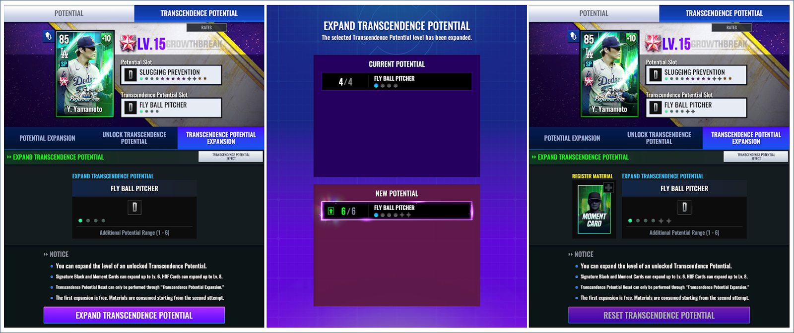 - 모먼트 및 HOF 카드의 초월 레벨이 기존 9에서 최대 15레벨까지 확장됩니다.