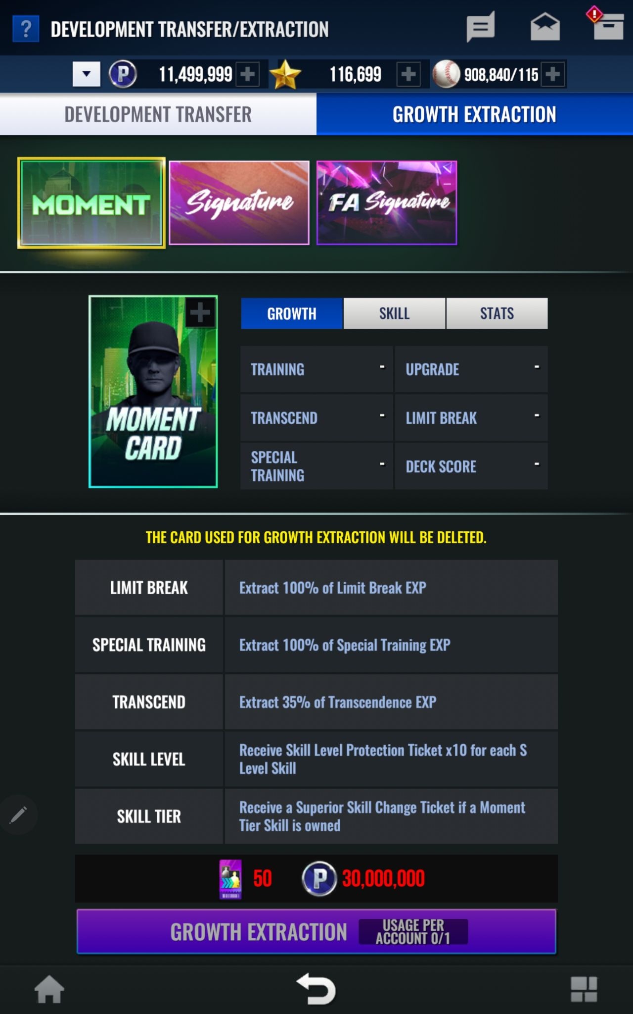 - 성장 추출 진행 시 기존 카드는 삭제되며 성장에 사용된 재화는 환급 규칙에 따라 환급됩니다.