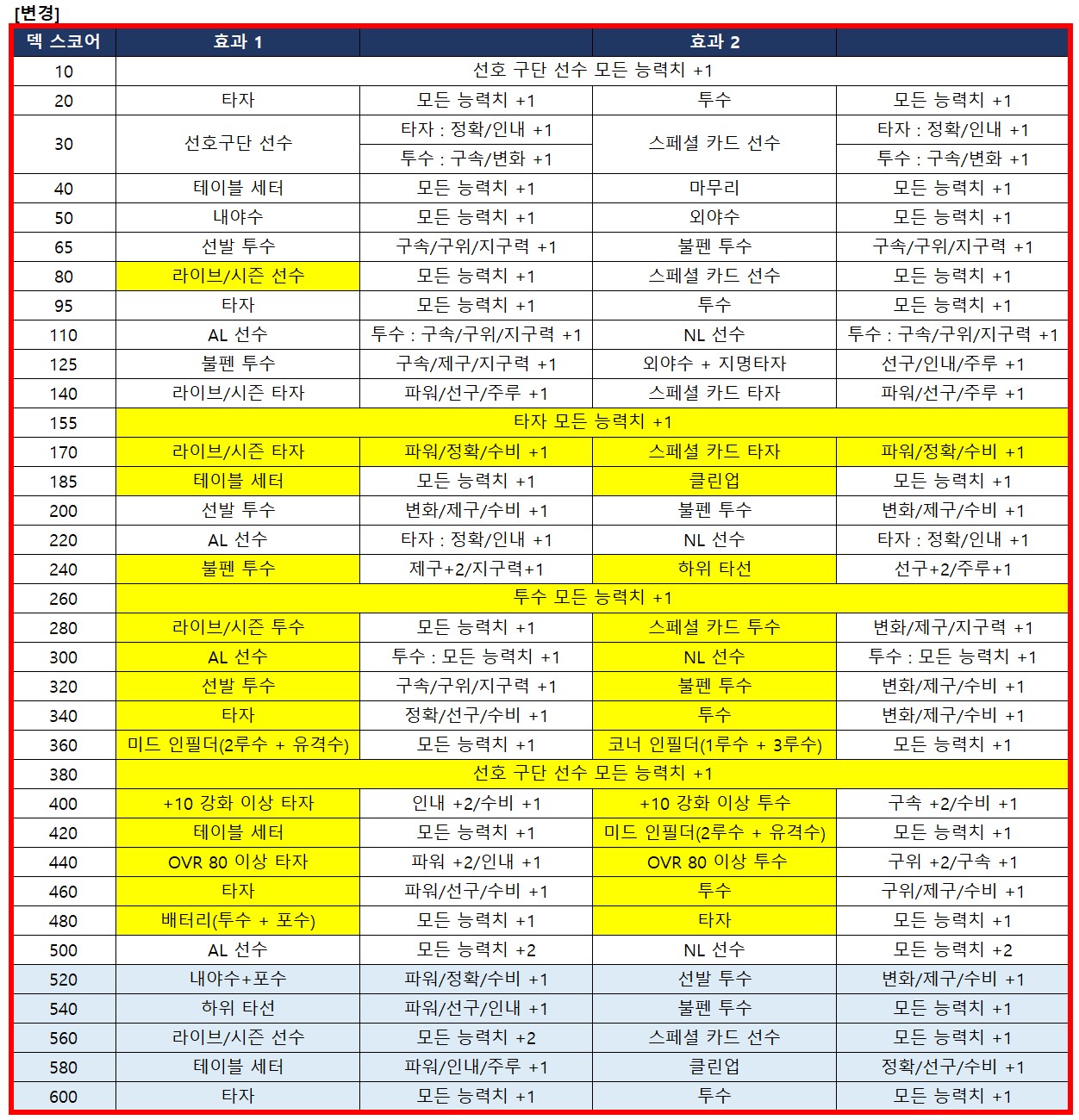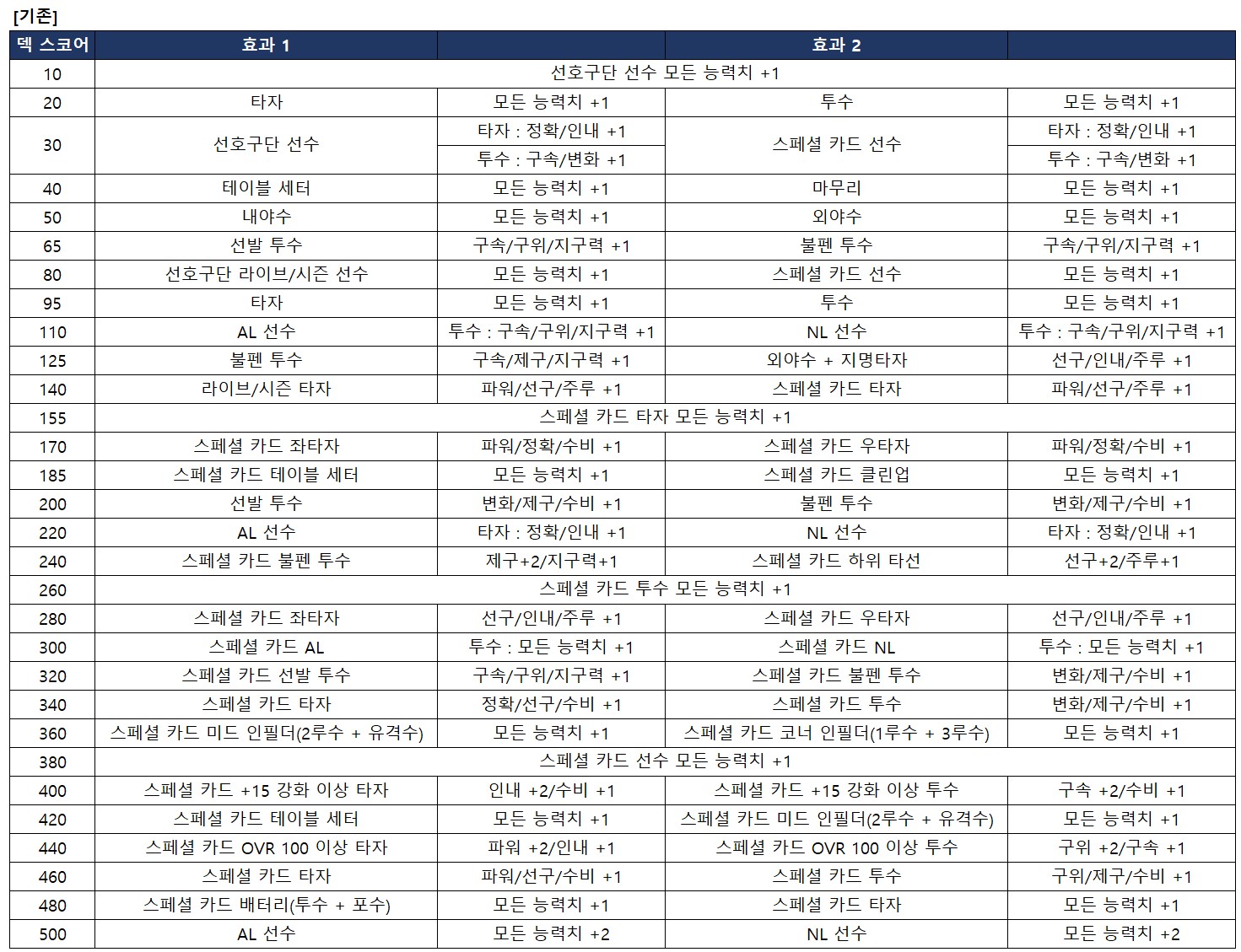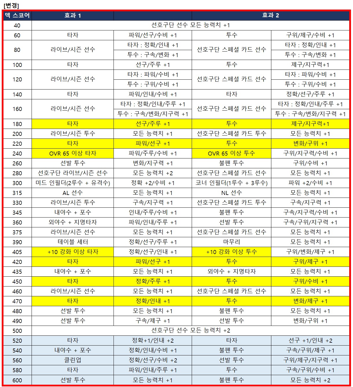 - 8/23(금) 업데이트 이전 개별 선수 획득 및 스킬 변경 확률은 [개별 확률 페이지]에서 확인할 수 있습니다.