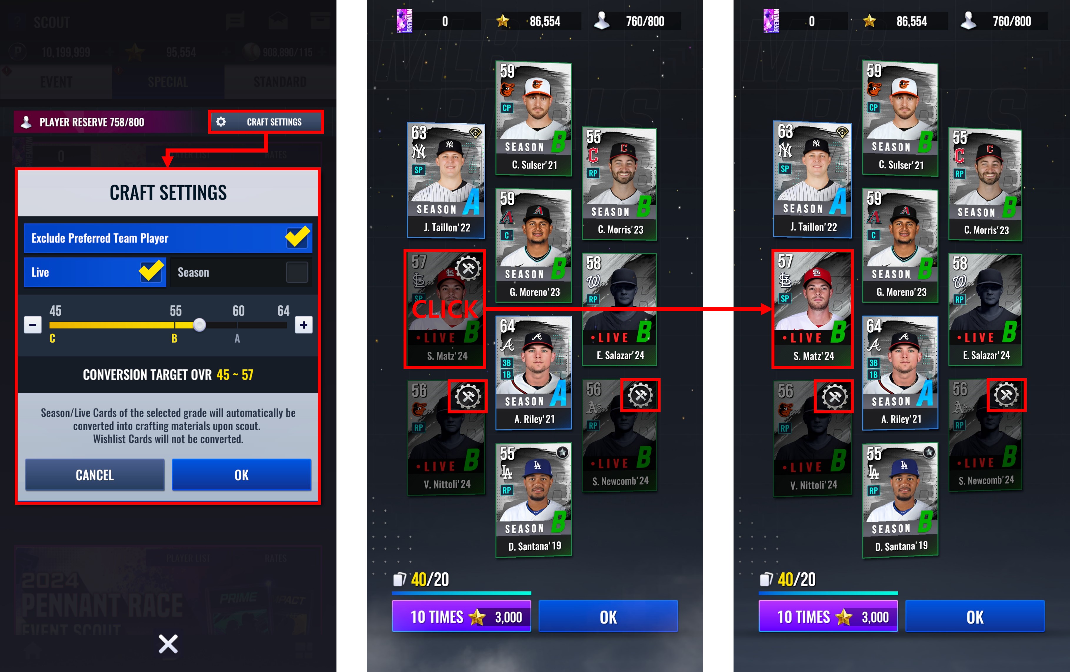- 스카우트 진행 시 등장한 카드를 해당 등급의 재료 카드로 즉시 변환할 수 있는 기능이 추가됩니다.