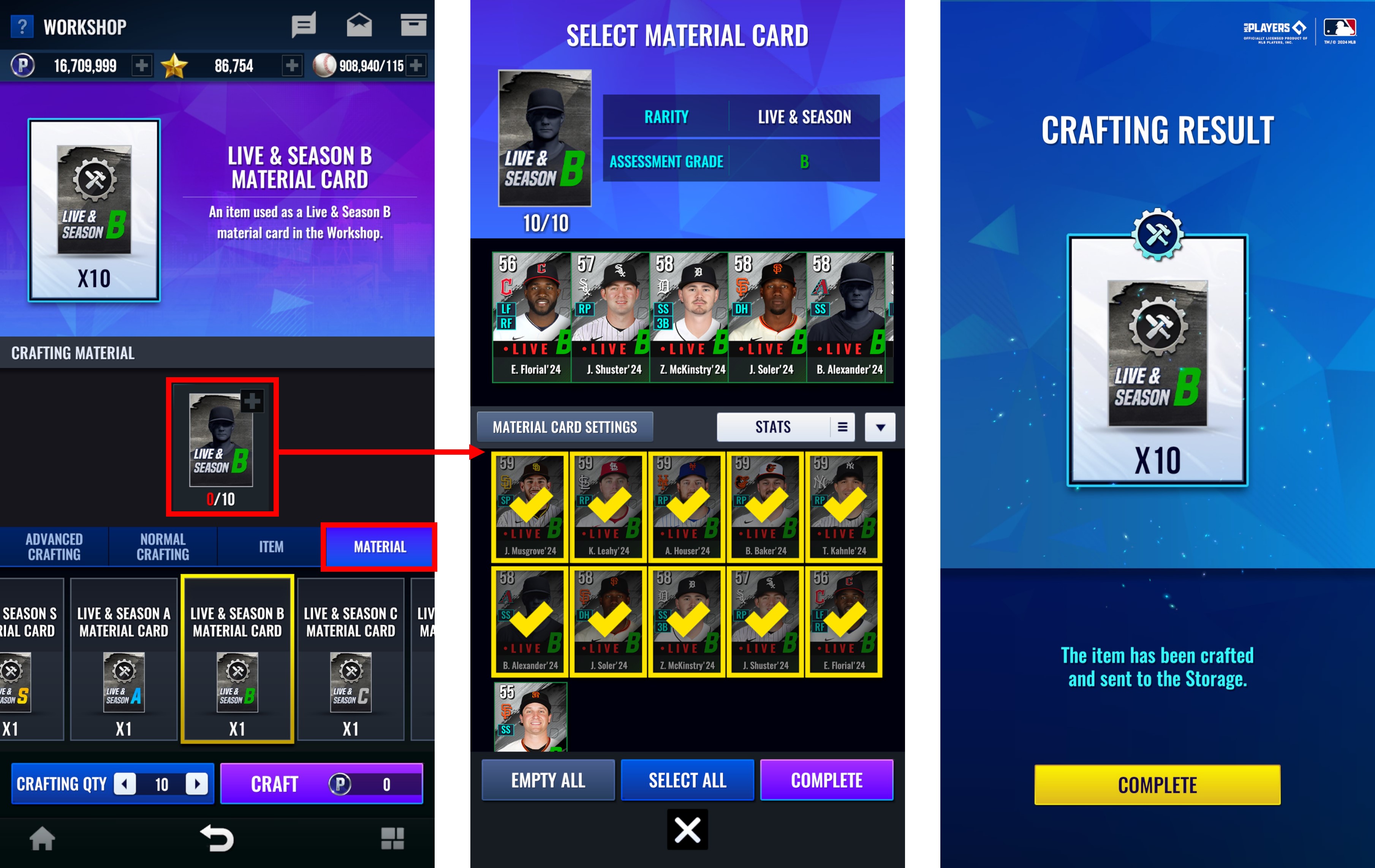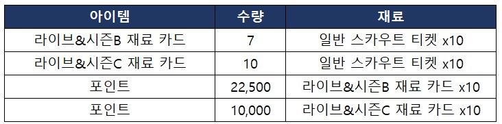 - 재료 카드는 아이템 제작 시 라이브&시즌 카드를 대체할 수 있습니다.