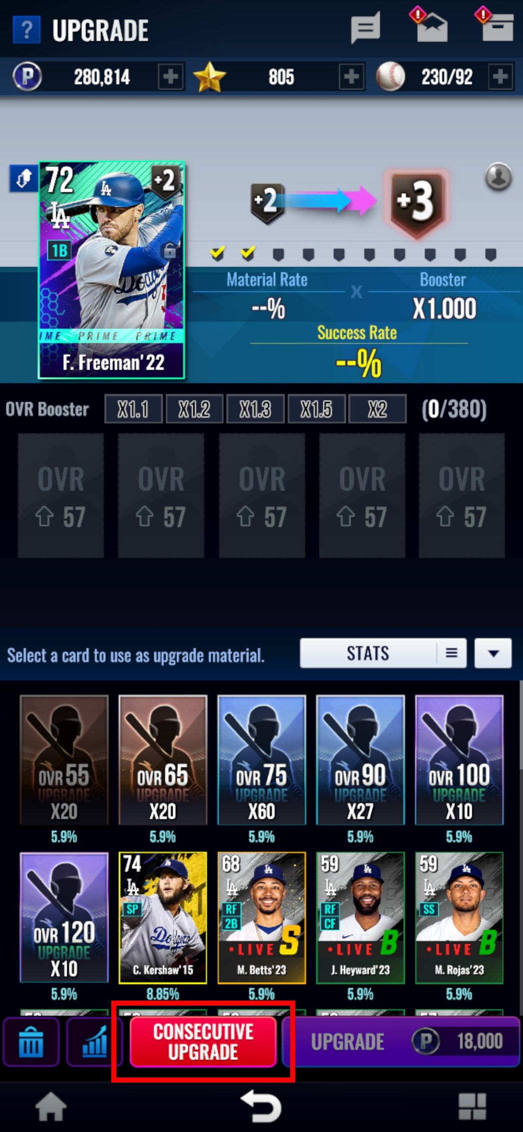 - 연속 강화는 강화 재료 카드 혹은 라이브/시즌 선수카드만 재료로 사용 가능합니다.