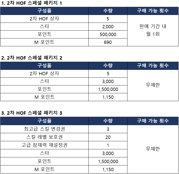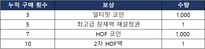 - 2차 HOF 스페셜 패키지를 구매하여 누적된 ‘누적 구매 횟수’는 다음 차수의 HOF 패키지 판매 시 이월되지 않습니다.