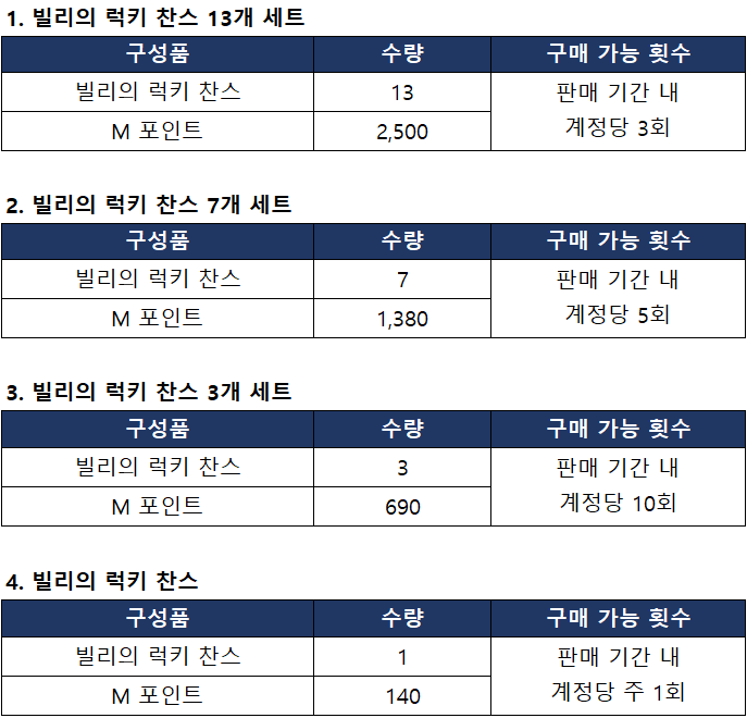 ■ 빌리의 럭키 찬스 묶음 패키지 판매 안내