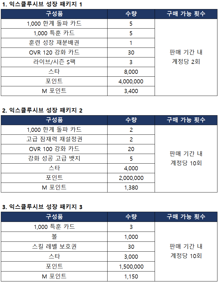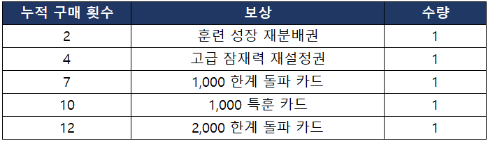 - 익스클루시브 성장 패키지 누적 구매 횟수에 따라 아래의 보상을 획득할 수 있습니다.