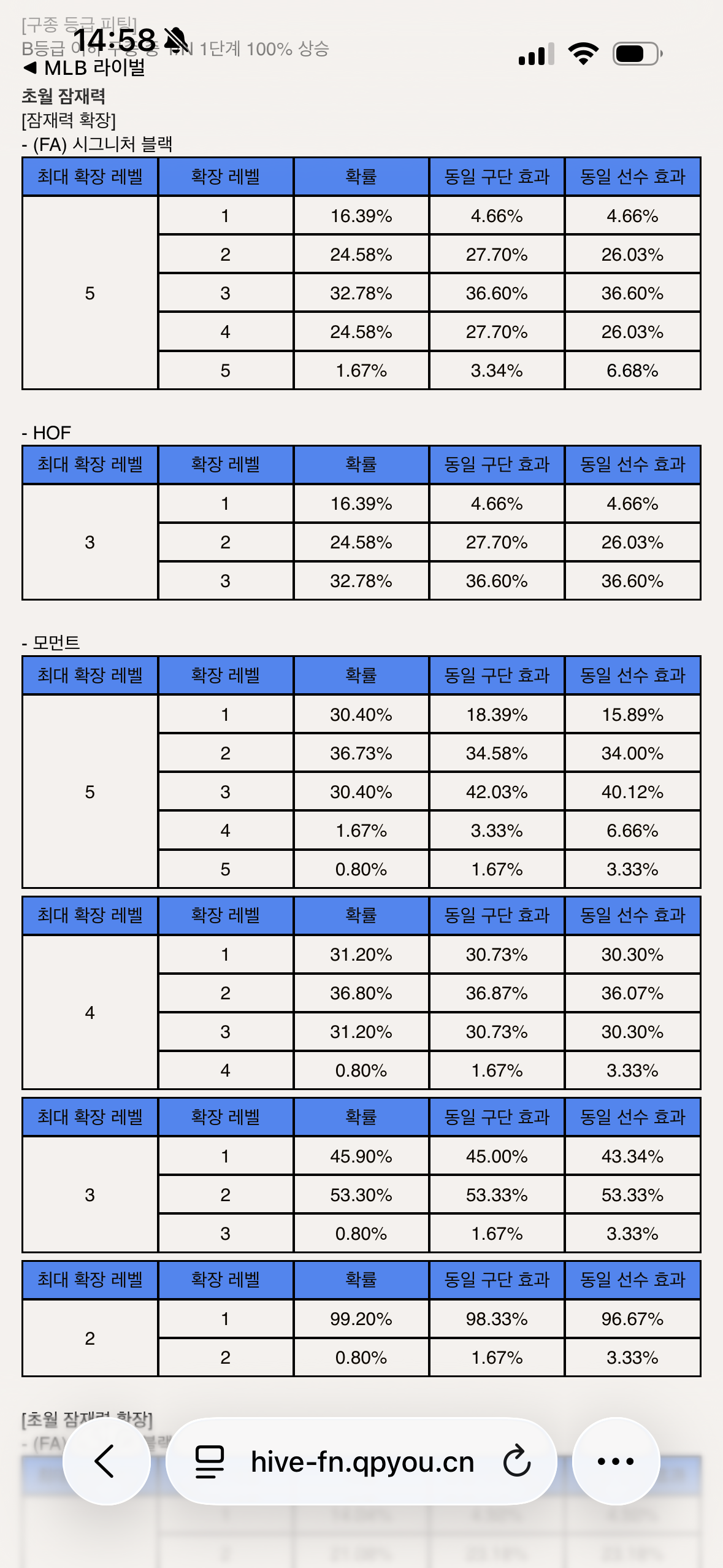 HOF 잠재 초월 확률 표에는 확장레벨 3이 뜰 확률이 32.78%라고 나와있는데 5장을 초월확장 시켜도 3칸은 하나도 안뜹니다. 확률을 다 합쳐도 16.39%+24.58%+32.78% = 73.75% 밖에 안되구요. 확장레벨 3이 뜰 확률이 높아서 들어간건데 버그 있으면 수정해주시고 잠재 확장 초기화 시켜주세요. 확률표랑 실제 확률이랑 달랐는데도 수정 안하고 초기화 안시키면 법적 조치 고려하도록 하겠습니다.