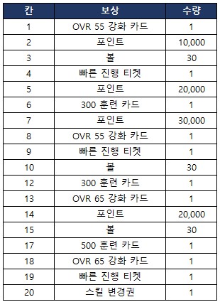 - 누적 트레이드 pt에 따라 구단 선택 선수팩, 한계 돌파 카드, 스킬 보호 등급권 등 다양한 보상을 획득할 수 있습니다.