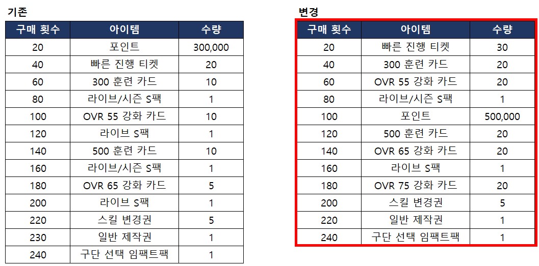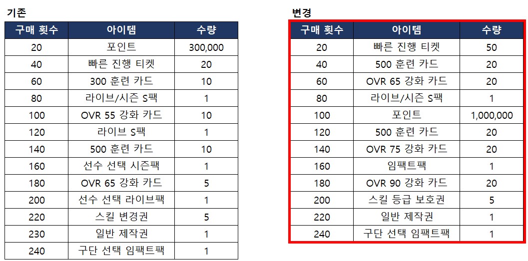 - 고급 스카우트 누적 구매 보상이 아래와 같이 변경 됩니다.