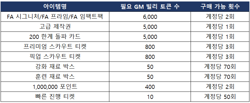 - 이벤트 경기에서 획득한 GM 빌리 토큰으로, 이벤트 상점에서 아이템을 구매할 수 있습니다.